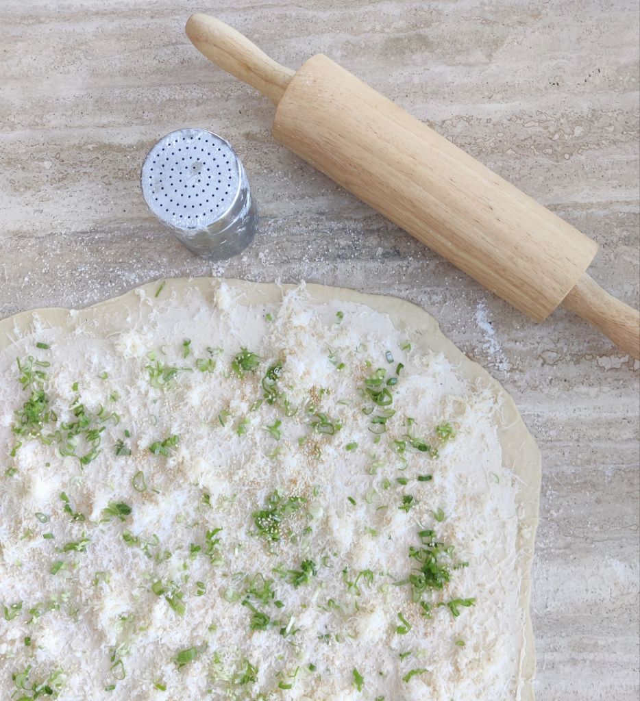 – Turn out the risen dough onto a floured work surface and roll it out into a rectangle of about 35 x 25 cm (like when making cinnamon rolls). Spread the cream cheese, grated cheese, and spring onions evenly over the dough. Sprinkle with cracked black pepper. Press down on the fillings so they won’t move when rolling the dough.